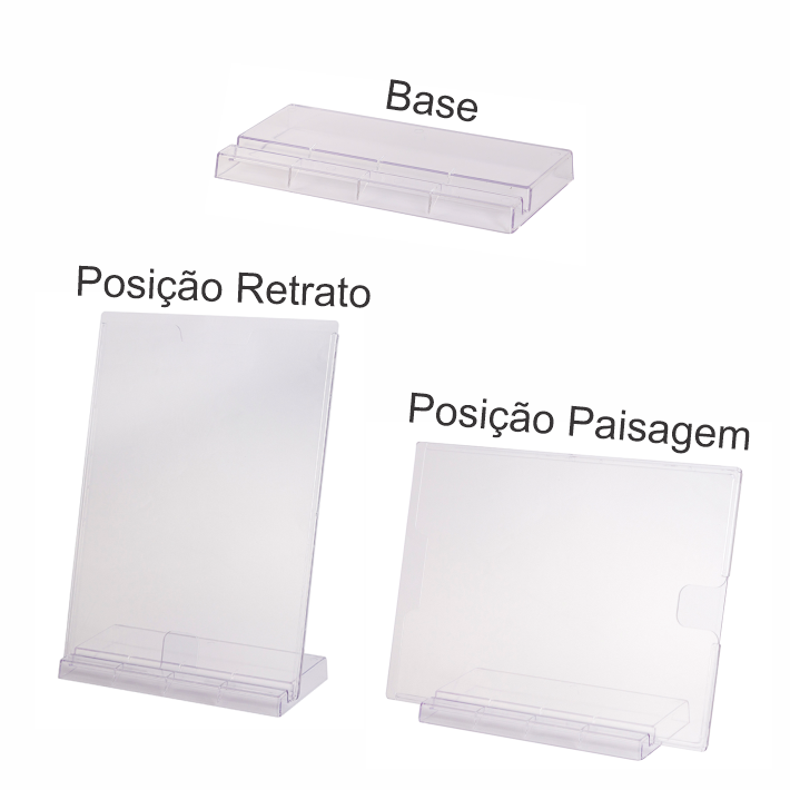 Display PS Cristal em PS Poliestireno (espessura de 2mm) para folha A4, com suporte para mesa. Podendo ser usado na posição retrato ou paisagem.