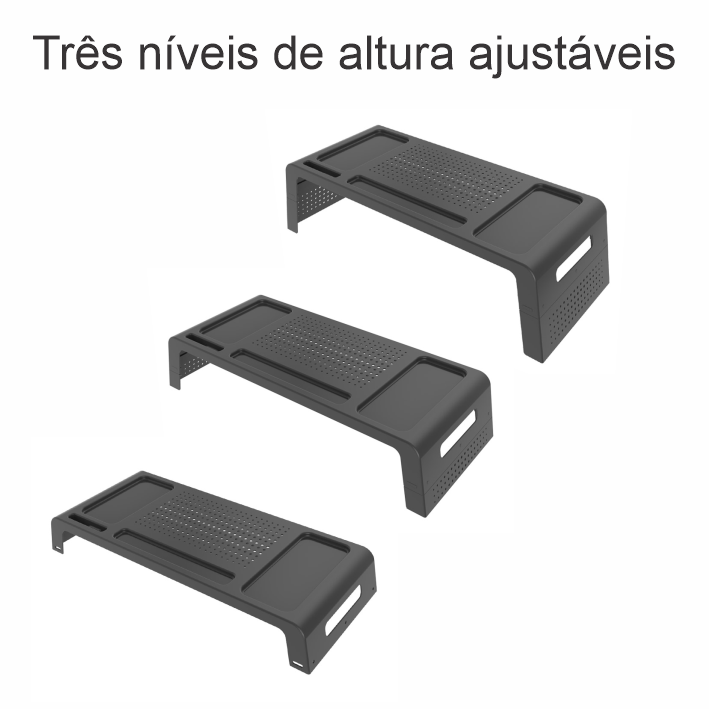 Suporte para Monitor em Poliestireno PS preto, com 03 níveis de regulagem de altura, com divisões para colocar canetas, grampeador, blocos para anotações etc.